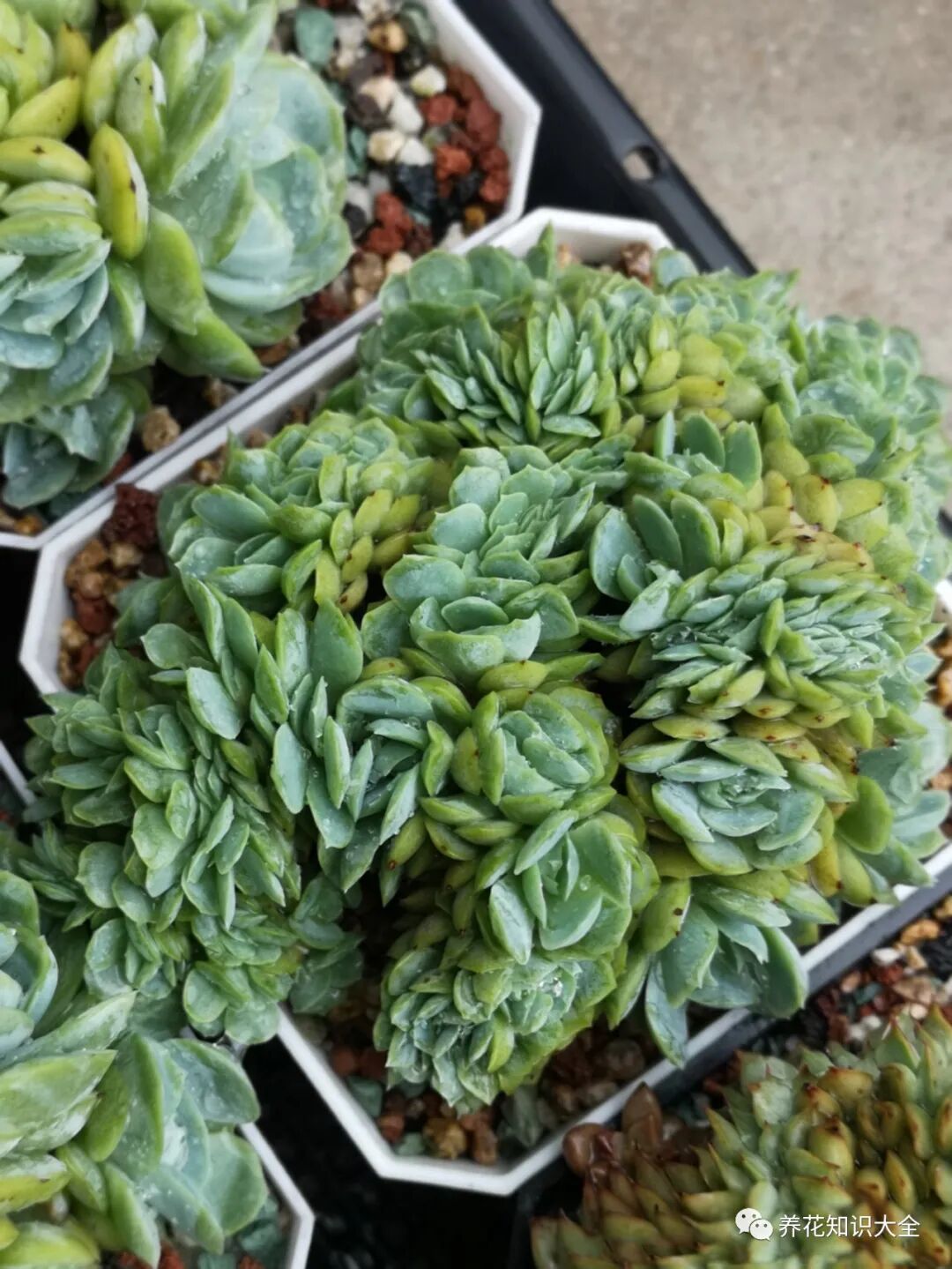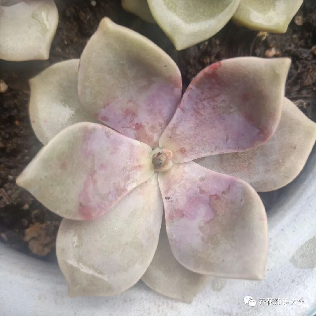 给多肉摘心的时候注意找到顶端中心的几片叶子就行,把他们摘掉之后大概20天左右又会长出新的头来,而且这次长出来的头会更多更密。