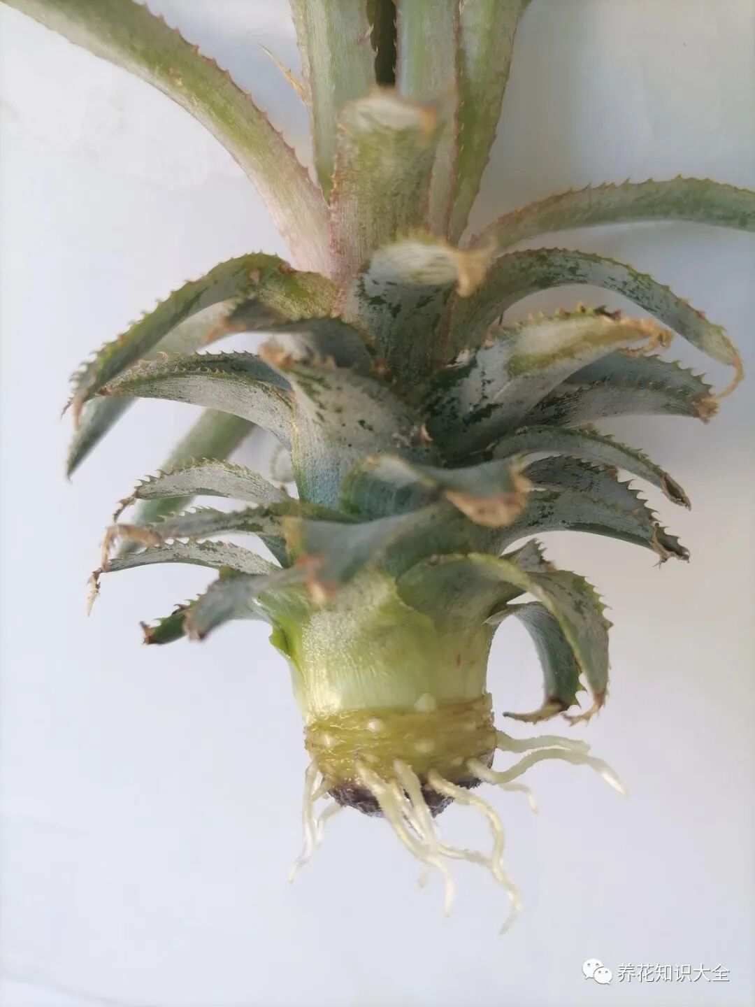 1、分离鳞茎。把菠萝头下面的果肉和皮切除干净,把底部的叶子也清理干净。
