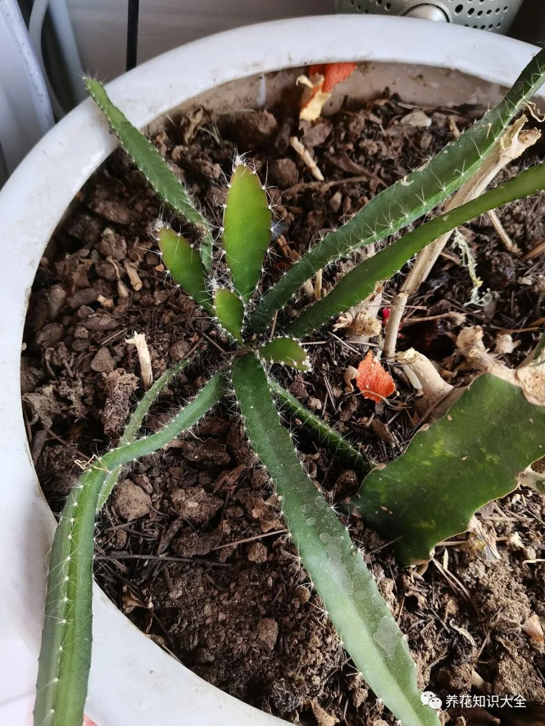 4、养护。芽苗长出来后,火龙果会继续生长,过个几周会长成带刺的“仙人掌”。接下来只要让幼苗接受充足的阳光就行了,生长的过程中要少浇水。虽然火龙果的幼苗生长比较快,但是要吃到自己种的火龙果却是需要比较长的时间,大概需要个3—5年吧!