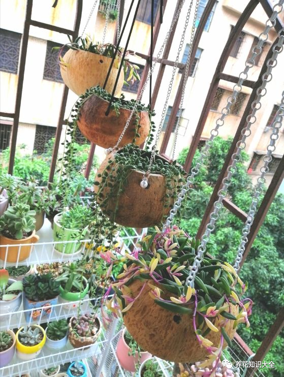 将土壤放进椰子壳里面,然后种上自己喜欢的多肉,吊挂起来养护多肉能够让根系生长得更好。大家家里要是有椰子壳的话,可以试试哦~