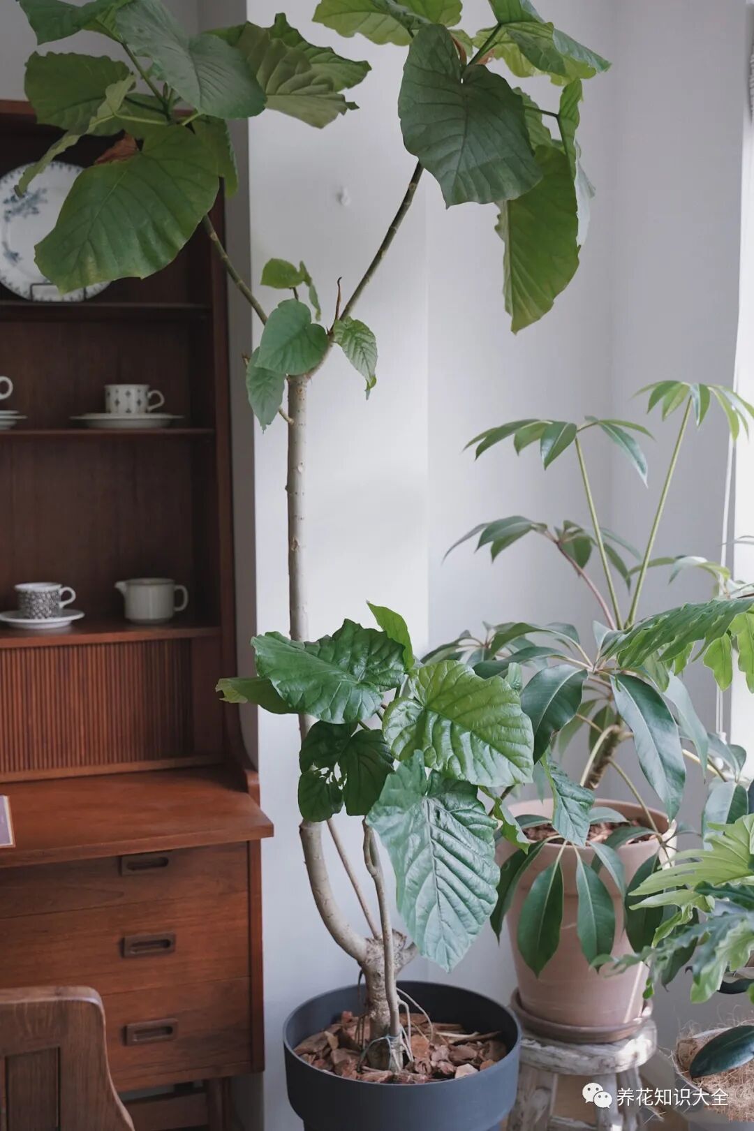 最近流行养龙鳞杆,也就是春羽的老化鳞茎,叶子脱落后会留下痕迹,看起来也很有韵味。这个龙鳞杆最好竖着捆绑起来,不要让它自己肆意生长,这样就不会太占空间了。