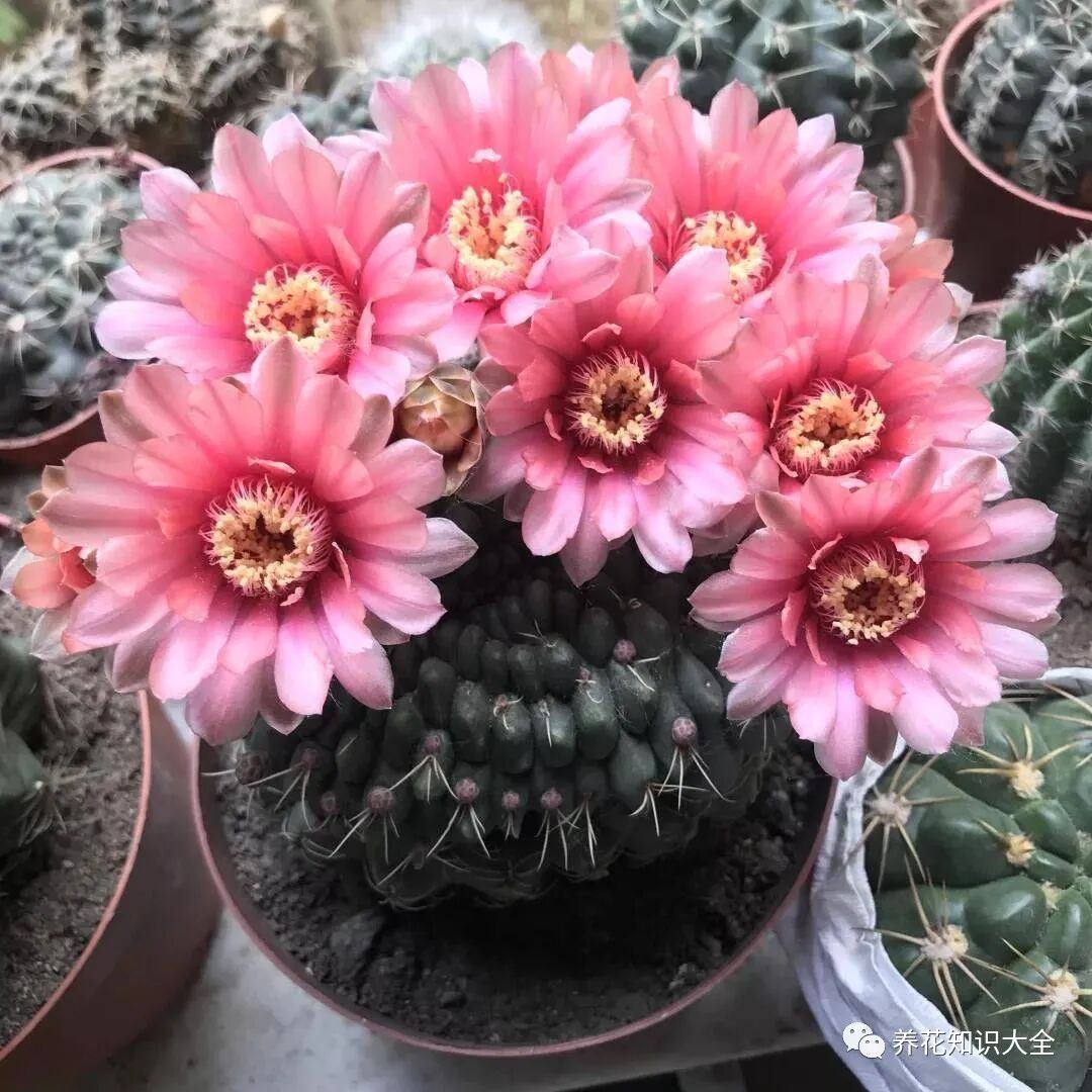 绯花玉仙人球特别好养,还容易开花。夏天养护得当的绯花玉,可以连续不断地开花。绯花玉耐晒耐热,无需经常浇水就能正常生长,是真正的懒人花。现在大一点的绯花玉,基本都已经在开花或者带着花苞了,买一棵直接有花欣赏。绯花玉品种比较多,花色各异,同时养几盆不一样的,开花就五彩缤纷。