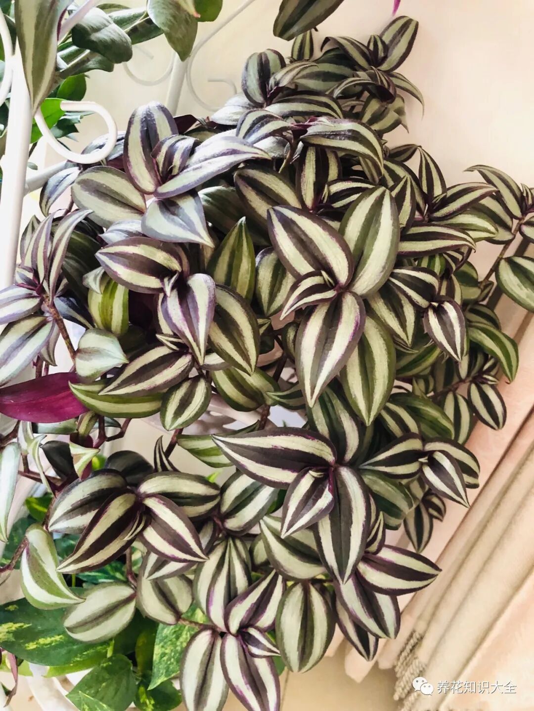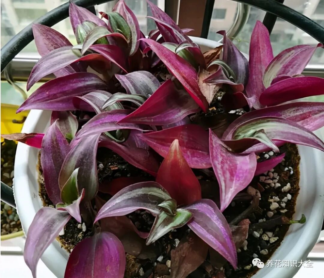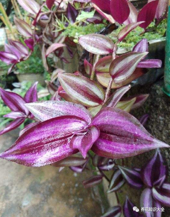 吊竹梅因为叶片的颜色是紫色的,养护在家里充满了浪漫的气息,既清新又淡雅非常好看,挂在家里养护,垂钓下来的叶片像是一片紫色的瀑布,别提多梦幻了。