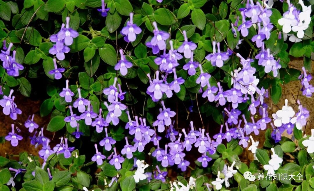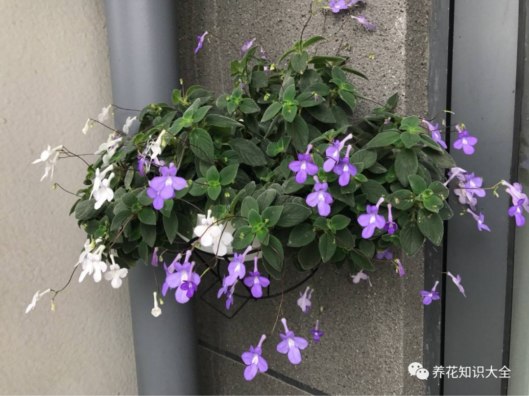 海豚花因花得名,碧绿的叶色配上蓝白色的花朵,再加上花型小巧别致,像极了一群活泼可爱的小海豚,别提多可爱了。我们可以把海豚花悬挂在高处养护,十分生动。