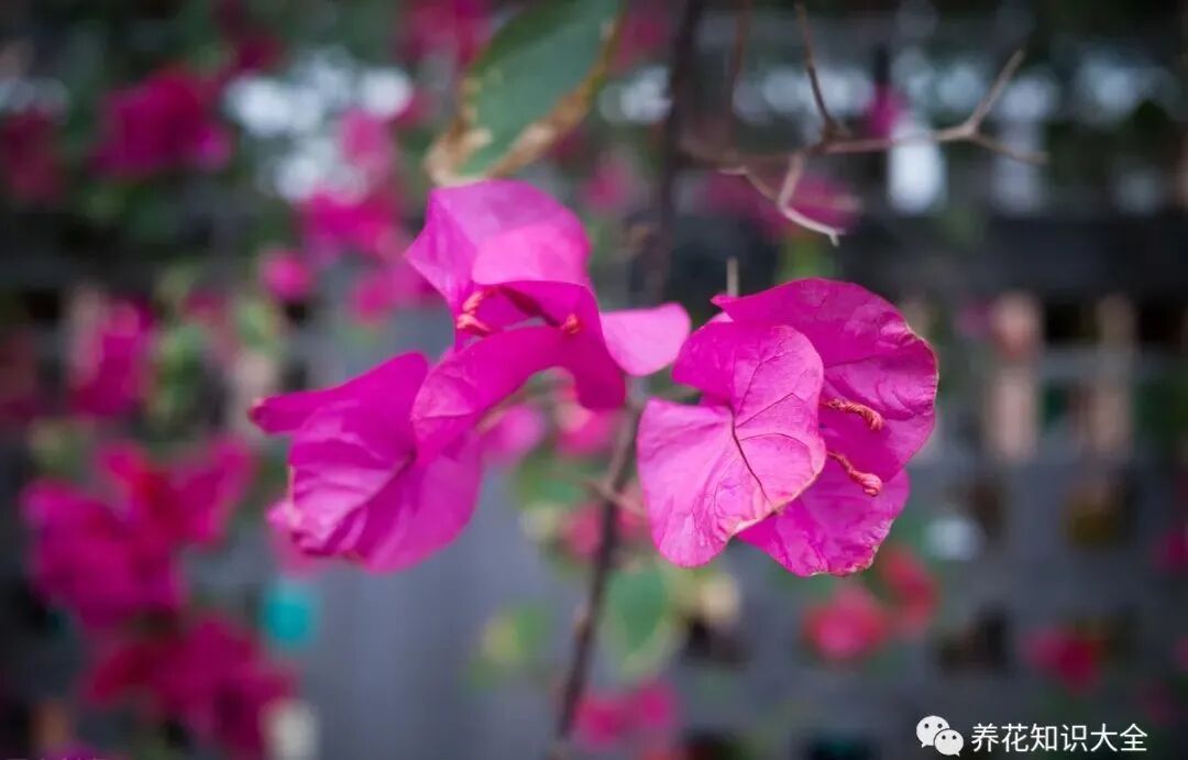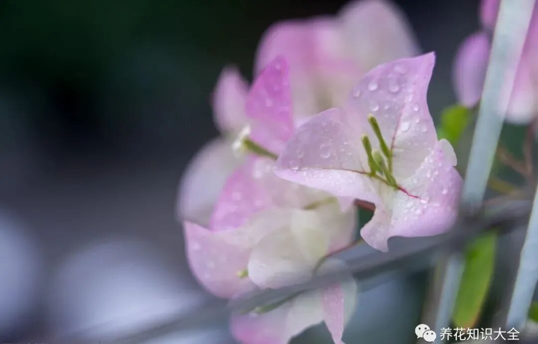 三角梅在盛花期的时候也不能淋雨,想让花期长,记得搬屋里。三角梅淋雨以后,花朵会快速脱落,或者花瓣互相黏黏在一起,然后腐烂凋谢。主要原因是三角梅的花瓣比较薄,三片花瓣围拢成一个小酒杯状,雨滴聚集在花朵上,花朵重量猛然增加,就会把花梗压断,导致花朵脱落。