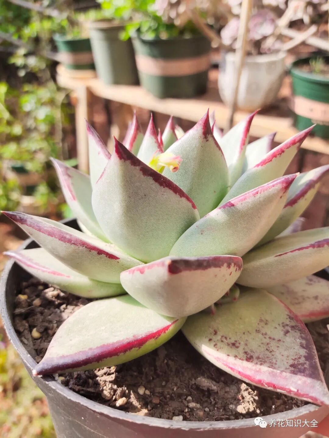 等到了秋天,阳光一晒,早晚温差一虐,蒂亚马上开始发生变化,一天一个样,越变越美丽。蒂亚还有一个优点,生长速度特别快,容易长小头。我的蒂亚一开始只有三个头,现在已经有上百个头了,差不多养了三年。只不过冬天严格控水,很多老叶消耗了,否则个头比现在看起来还大。
