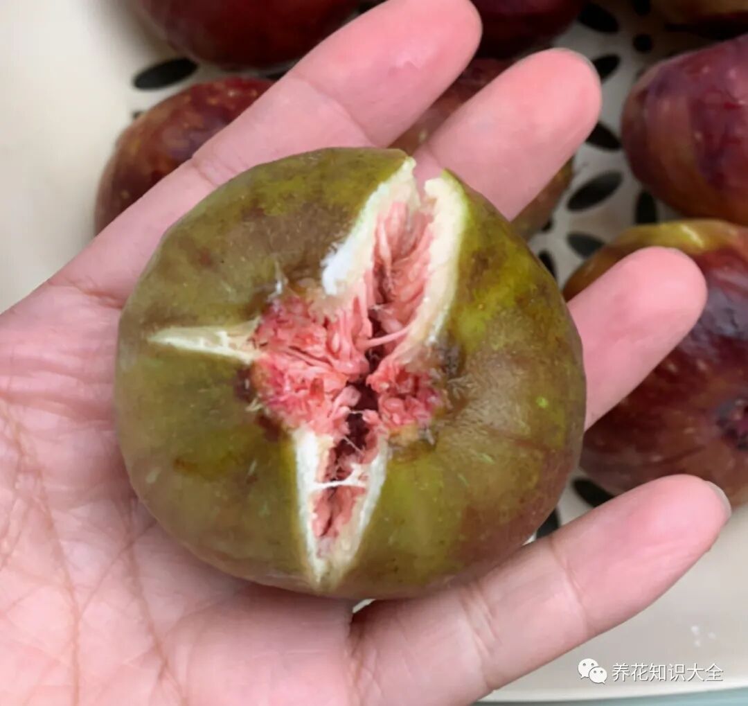 那我们如何判断果子是不是成熟呢?等到果子发红,果子屁股的位置裂开,捏一捏果子变软就可以吃了,没带果的树苗养一养也会结果,摘完一茬又长一茬,一直能吃到10月份都没问题呢!无花果要是养好了,还是很丰产的~