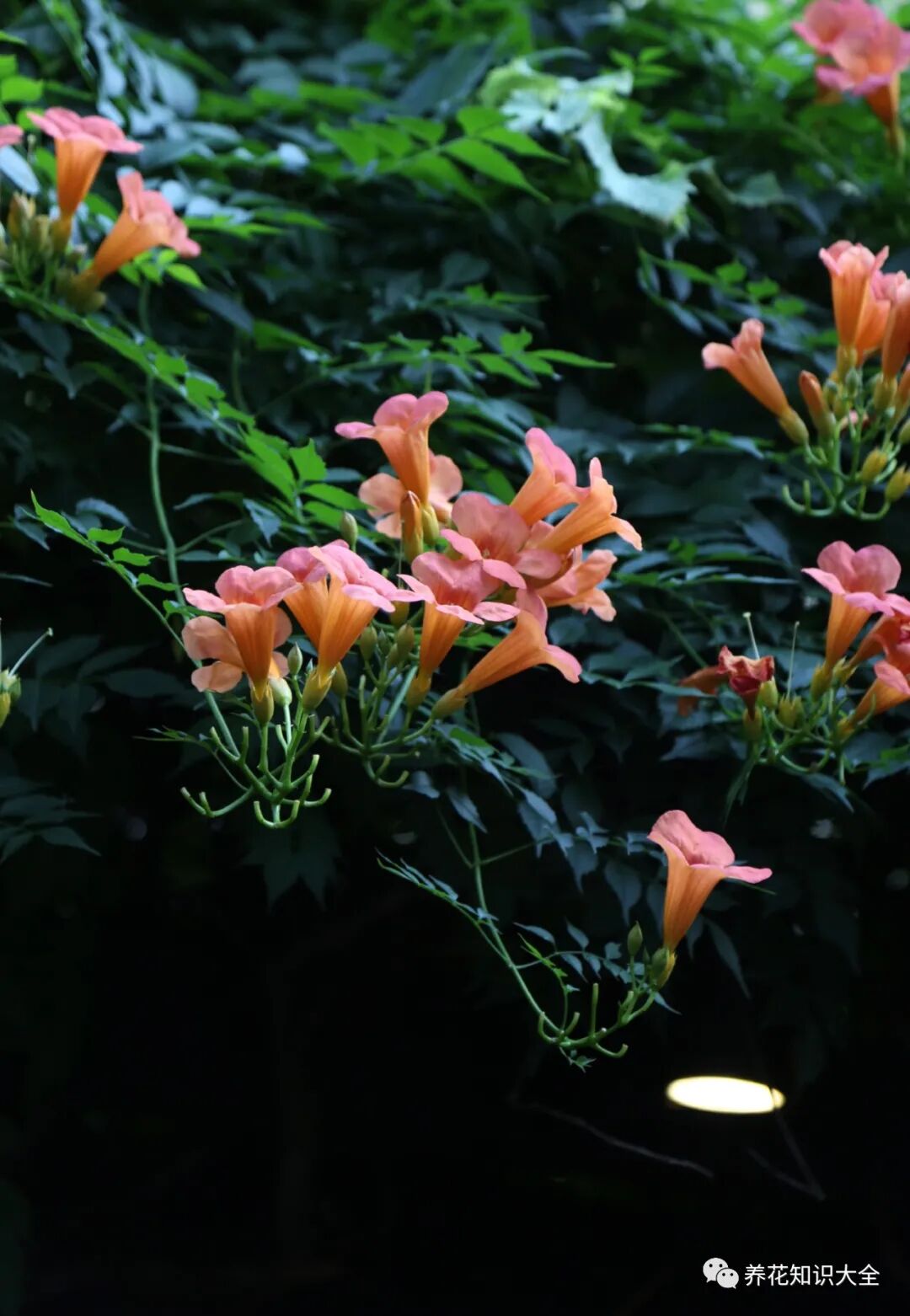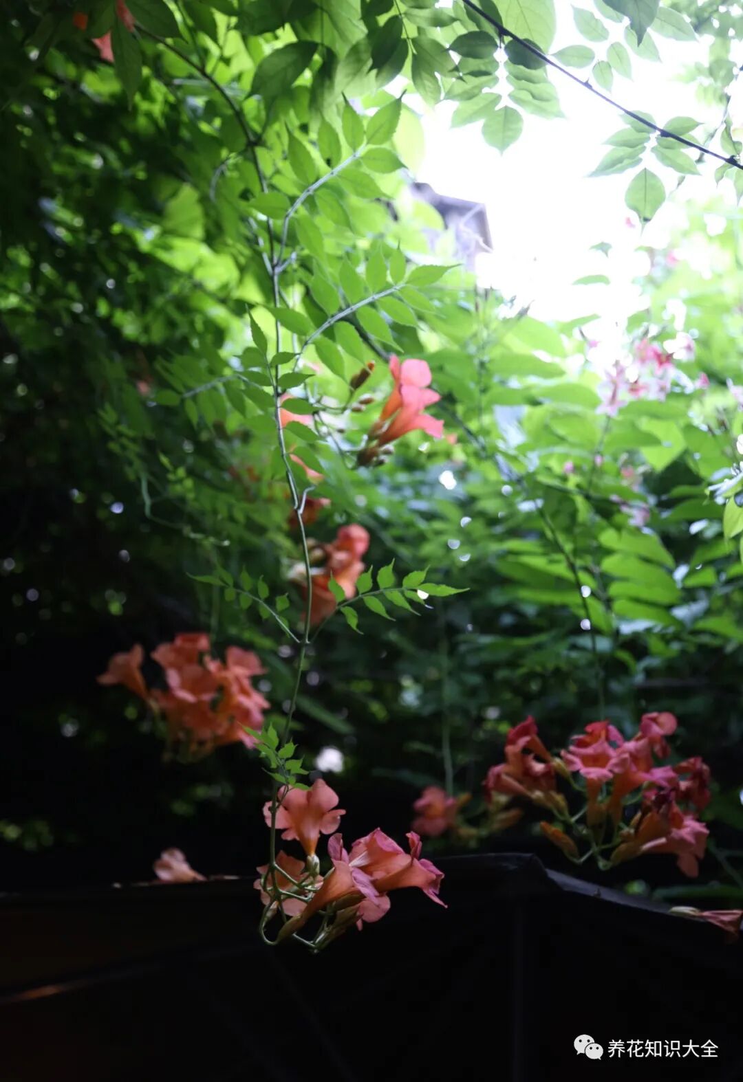 凌霄花是喜光性植物,想让长势好,开花多,就一定要保证充足光照。每天直射光时间保持在5小时以上,凌霄花不但长得快,叶间距还特别紧凑,整株看上去都好看。要是光照不足,凌霄花叶色偏黄一点,叶间距拉大,枝条快速拔高,只见枝叶不见花,就没有什么意思了。