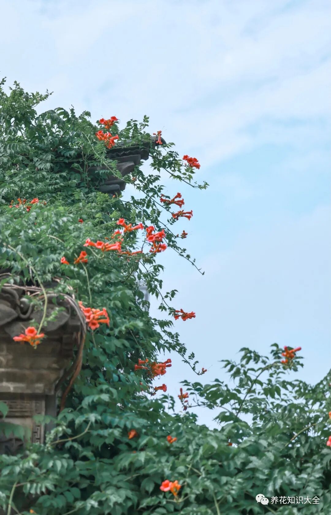 凌霄花只要成活,就像打鸡血一样疯长,是拔不完的“花坚强”,让人又爱又恨。很多人种凌霄花的时候满怀期待,种下几年就头疼不已。凌霄花的生长速度特别快,从三四月开始,能一直长到九十月,就算夏天温度特别高的时候也不停歇。