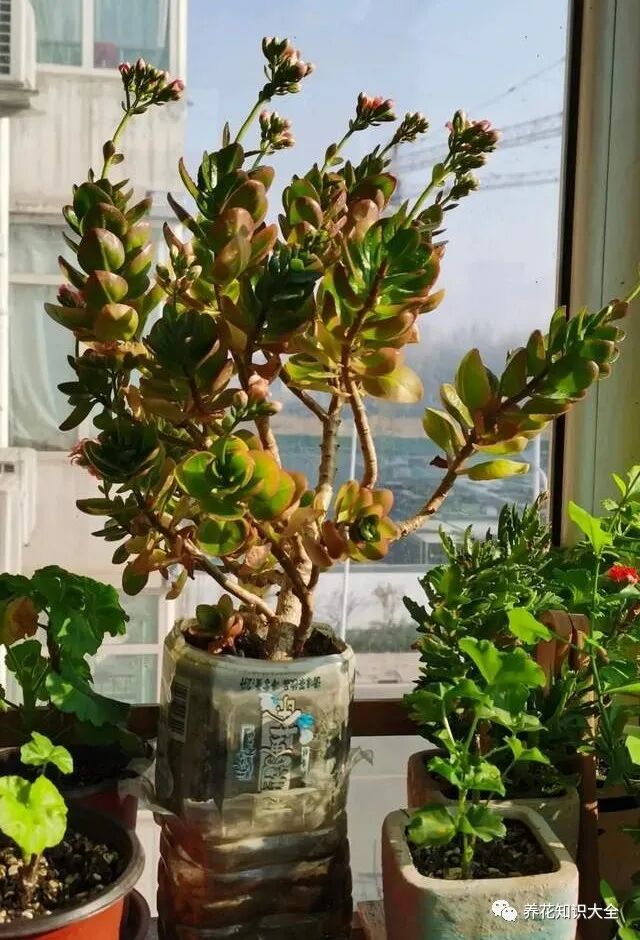 瞧,下面这一盆长寿花就是用的茉莉花茶的饮料瓶子栽种的。看长寿花的枝干也知道它是一棵两三年大的老桩了,枝干很粗,也木质化了,想必在这个花盆里面也种了有相当长的一段时间了。可见这个饮料瓶,还是十分结实耐用的。养长寿花,花盆一定要透气,因此这个饮料瓶底部和侧面都是打了孔的,来增加它的透气性,因此它才会长得更好。