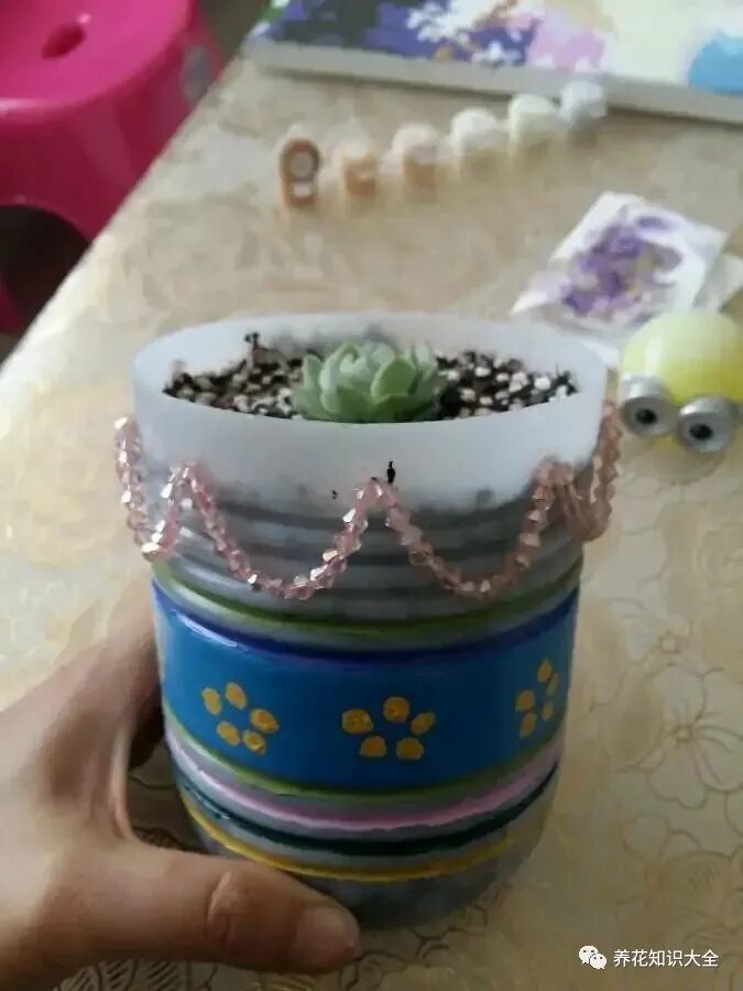 喝完牛奶,剩下的瓶子从中间划拉一刀,装上颗粒土之后,种上多肉也是美美的。如果觉得瓶子不好看,拿出颜料和画笔涂上几笔,就是独一无二的盆景了。多肉植物的根系一般都比较浅短,因此用这些饮料瓶的栽种的话,也是需要打孔的哦,侧面也最好能够多开一些孔,增加其通透性。
