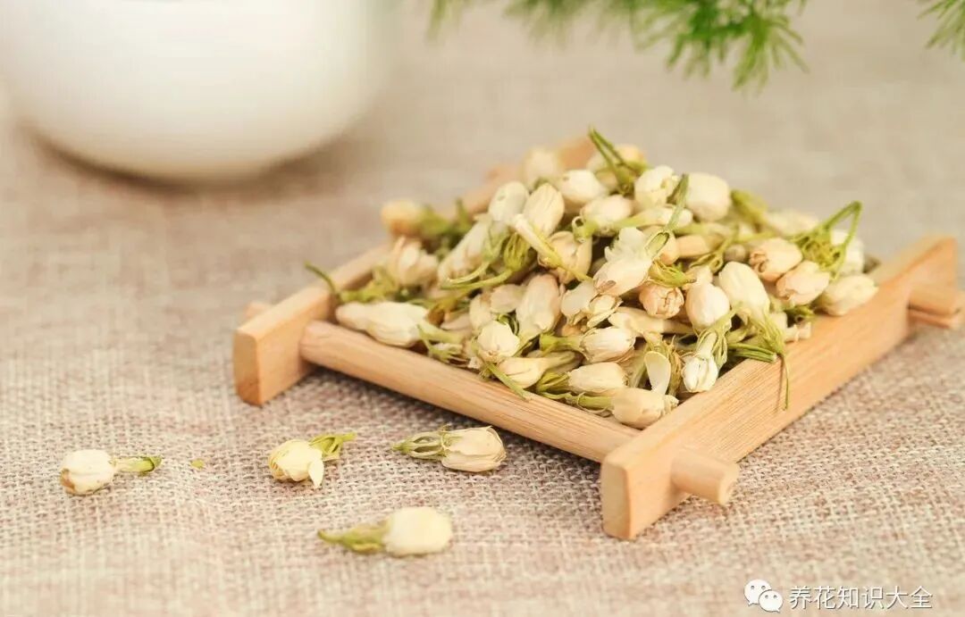茉莉花苞摘下来晒干可以制作花茶。喝过之后唇齿留香、神清气爽、心旷神怡。