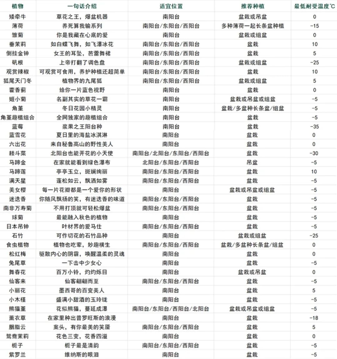 还有很多很多植物都没有介绍上呢,大家可以根据下表来选择哟。