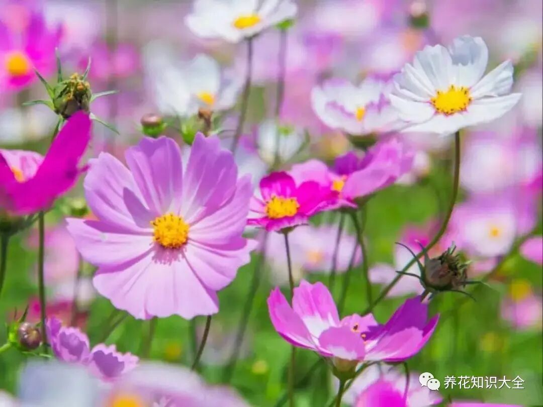 波斯菊又被叫做格桑花、秋英,集中在夏秋时节6-8月开放,耐热耐晒皮实,花后结种子,种子掉土里自播,春天会自己发芽,可以长一大片。