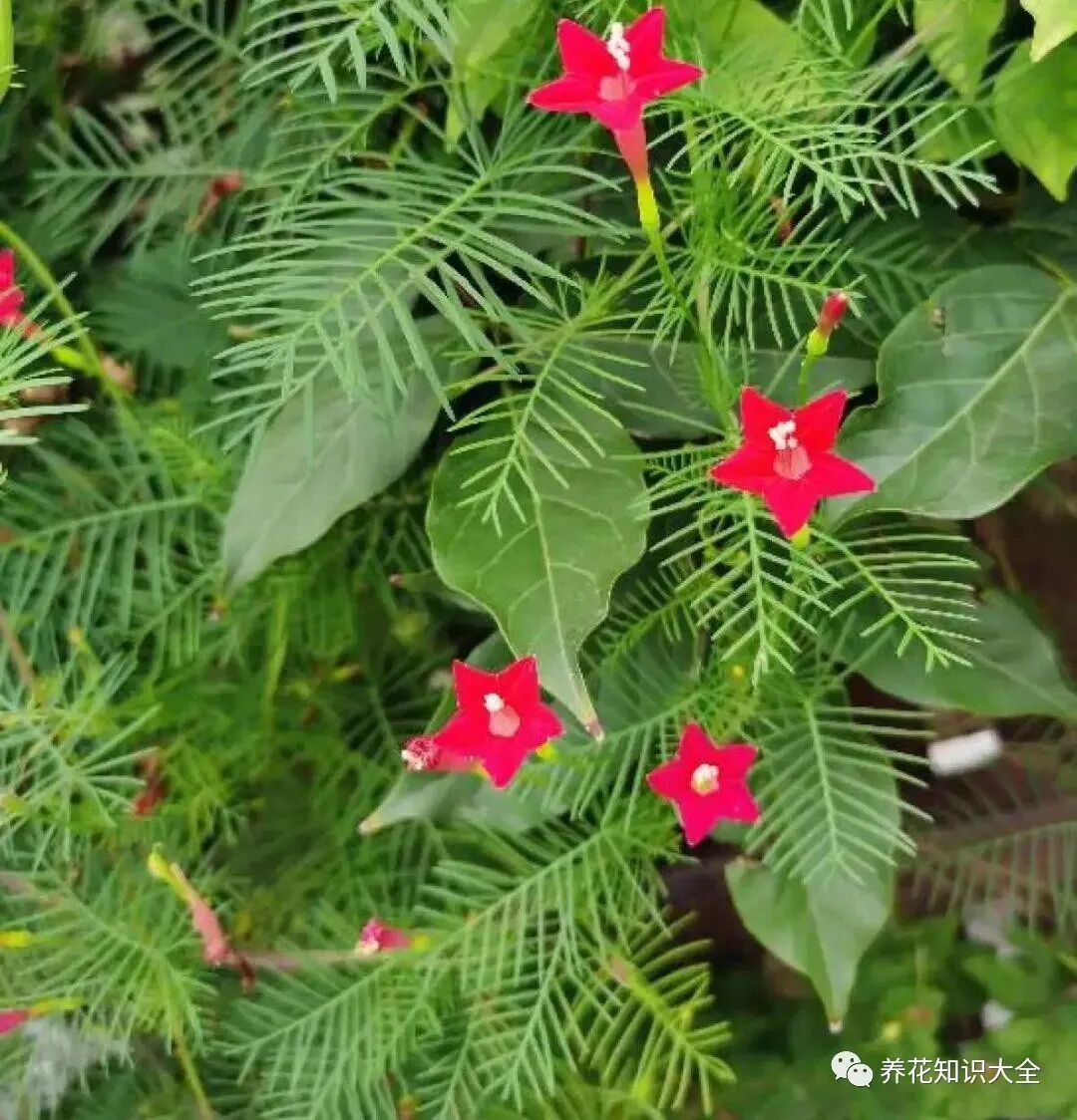 茑罗是夏天里的爬藤花,花期在7-9月,不怕晒不怕热,藤蔓疯狂生长,开出朵朵五角星花朵,有红色粉色白色,而且它还没有病虫害,种子撒土里就活。