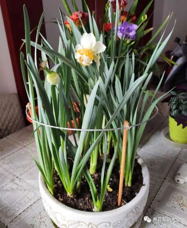 我们可以在花盆一圈插2~3根筷子,把过长的枝叶用绳子或细铁丝圈起来,然后固定在筷子周围,这样既不会限制它们的生长,还有助于矫正株形。