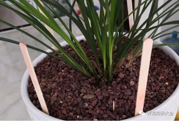 有些聪明的花友,喜欢在花盆里插入一根筷子,插到花盆的三分之一或是四分之一处。对于喜水的花卉,一般盆土表面四分之一处干了,就可以浇水了,比如说绿萝、吊兰、天竺葵、蓝雪花、发财树等。