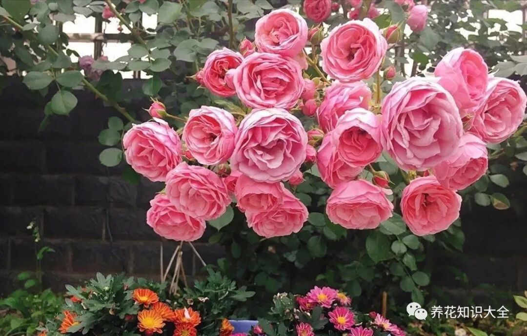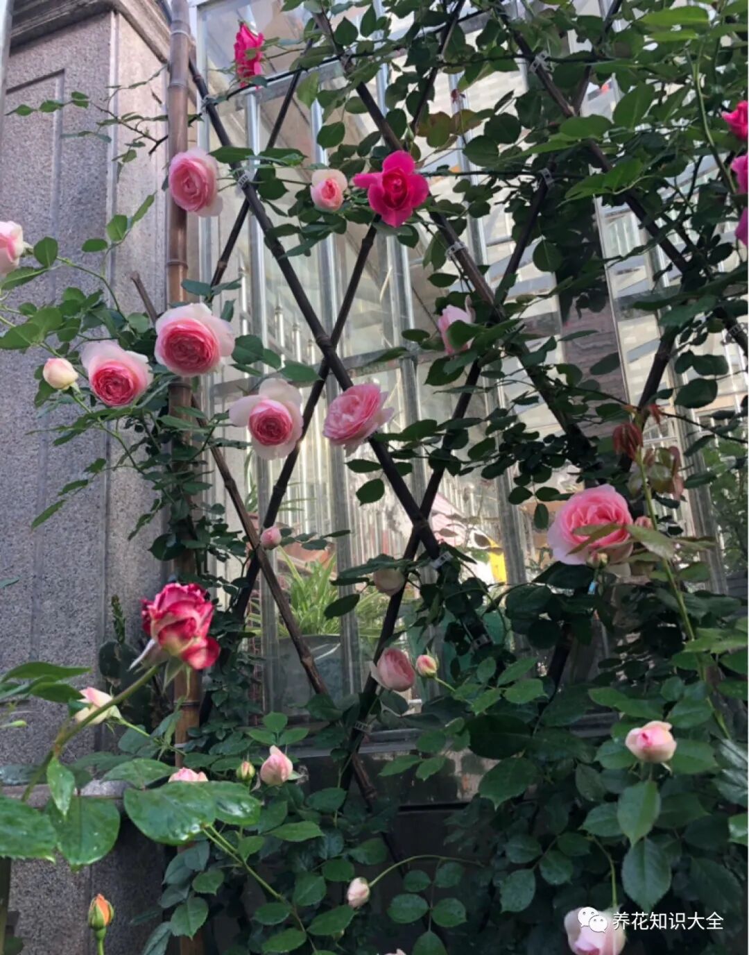 之前有个花友晒她家的院墙,全是藤本月季,看着让人好羡慕。她家原来的院墙很矮,只有七八十厘米,因为喜欢藤本月季,她就在院墙周围种了十棵左右。等藤本月季长高以后,她把粗壮的枝条横拉,固定在原来的院墙上。就这样不断地横拉固定,现在她家的院墙总体高度已经有1.5米以上了,私密性比之前好了很多。