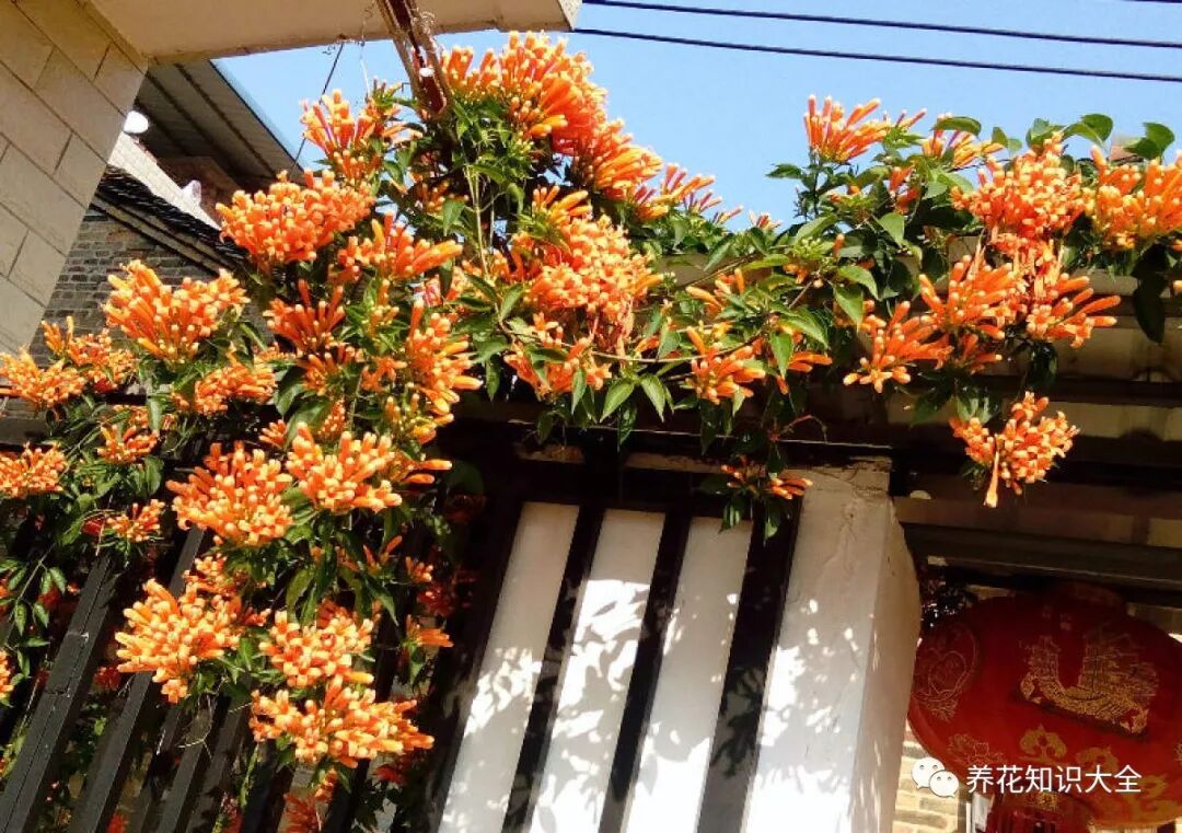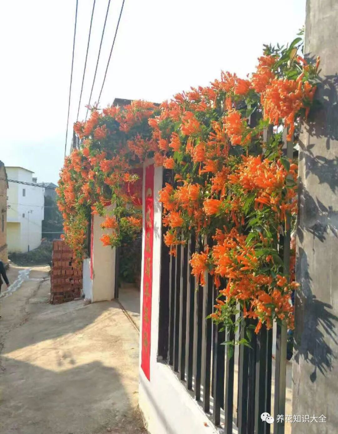 在冬天温度能保持在0度以上的地区,院墙周围栽种上炮仗花也是极好的。炮仗花生长速度很快,藤蔓可以长到五六米长,院墙周围一般栽种两三棵,就能把整个院墙都爬满。有花友就用炮仗花爬满院墙,私密性好不说,冬春季节开花时还很漂亮。
