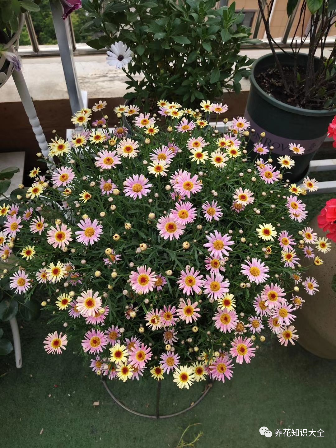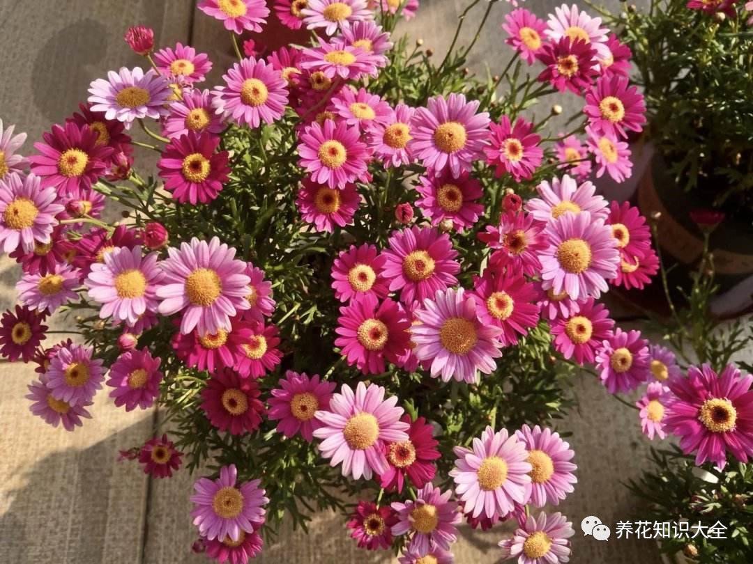 养护要点:玛格丽特养护的时候要学会摘心打顶, 摘心之后能够刺激它长出更多的小芽了,对植物的生长还是有很大好处的哦~再用点羊粪肥,鸡粪肥,补充养分才能保证一茬一茬花开不完。