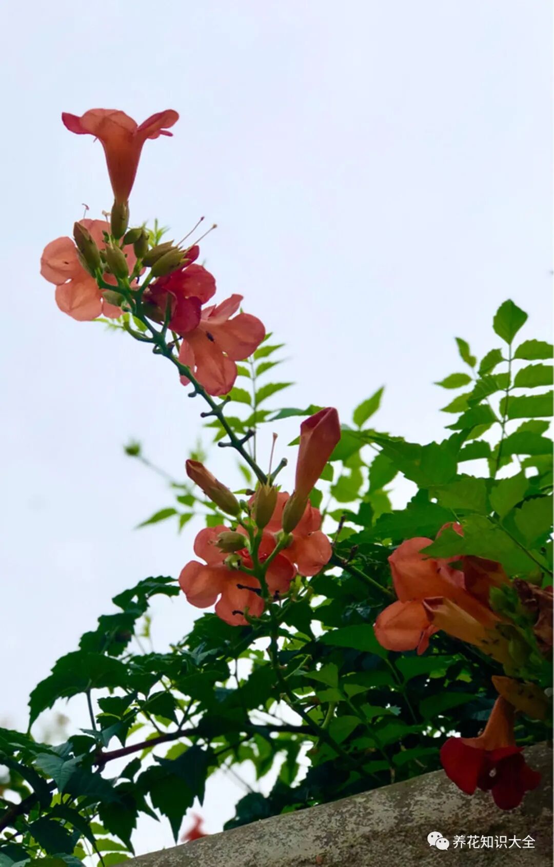 在爬藤花卉里面,凌霄花是比较强势的一种,生长速度超级快。要是想美化院子围墙,可以栽种凌霄花。凌霄花花期长,基本不生病虫害,零下20度冻不死,一年栽种多年赏花。但是凌霄花长势太强劲,放任生长很容易影响周围其它植物生长。所以地栽凌霄花一定要做好修剪,避免到处攀爬。另外,院子小的话,不建议地栽凌霄花,可以盆栽养殖。