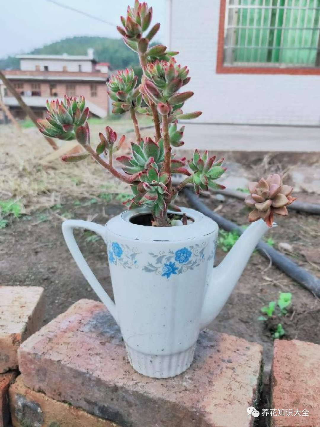 水壶要想变盆栽,只需要简单的3步就能做到,花样多多,还能打造出小巧精致的效果。花友们还有其他的奇思妙想吗?