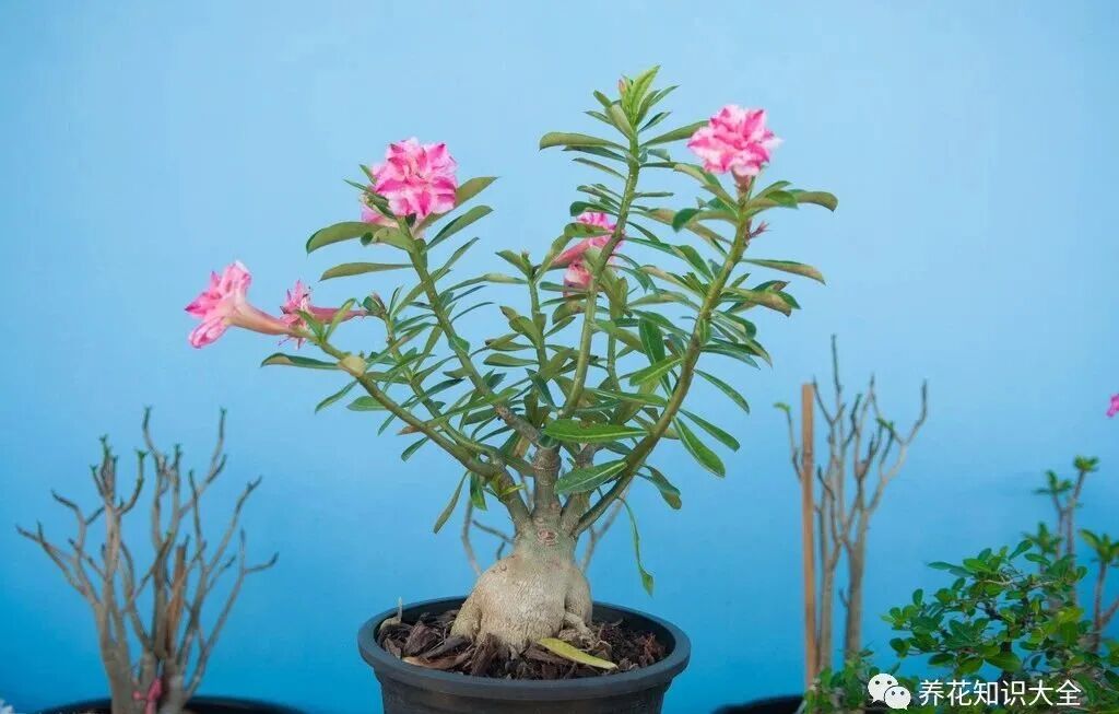 沙漠玫瑰除了耐热耐晒以外,还特别耐干旱。它粗壮的茎秆里面储存着大量养分水分,像骆驼一样耐旱,就算长时间不浇水,也不容易旱死。养护得当的沙漠玫瑰,从夏天到秋天,可以开三次花,特别漂亮。花市遇到沙漠玫瑰,别看不上,该入手了!