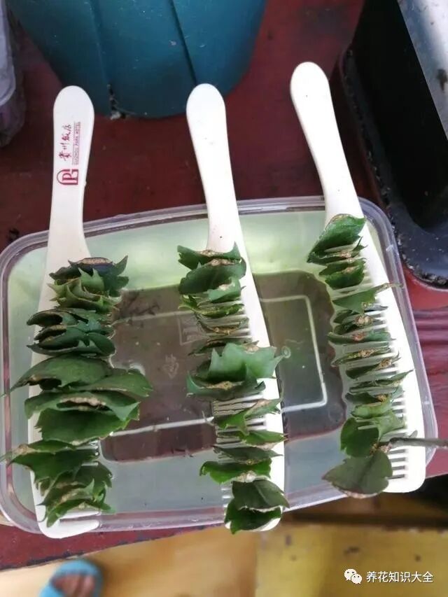 首先准备一个容器装满水,准备几把梳子,把梳子横放在容器上,梳子有齿轮的一面正对水面,然后把蟹爪兰枝条有芽点部分朝下,把叶片插在梳子上,叶片的底部刚好能接触水面即可。