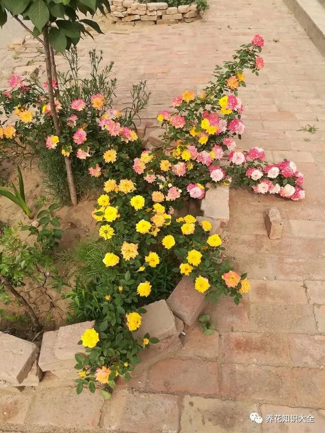 实事求是的讲,藤彩虹的花朵在众多花大色艳的藤本月季里,并不算出色,反而显得很“挫”——花朵小小的,直径就5公分,花瓣数也不多,更像是野蔷薇,但是——它的花色非常出色,富于变化,能同时开黄、朱红、粉色、白色等颜色花朵,一树多色花,绚丽如彩虹,视觉观赏效果极佳!