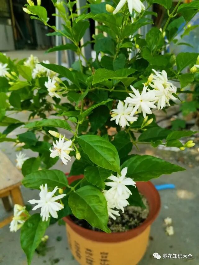 单瓣花,花色洁白,花朵较大,是茉莉中最香的一个品种。花苞像笔尖,花量非常大。