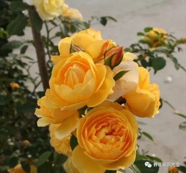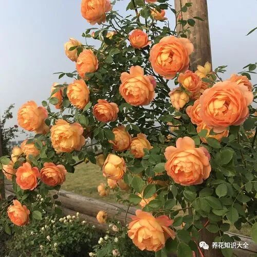 特点:大型藤本月季,开花性非常好、多季开花、勤花,橙黄色花色,带有一种温和的老玫瑰香气。长势强健、枝条也比较的硬,比较耐晒。