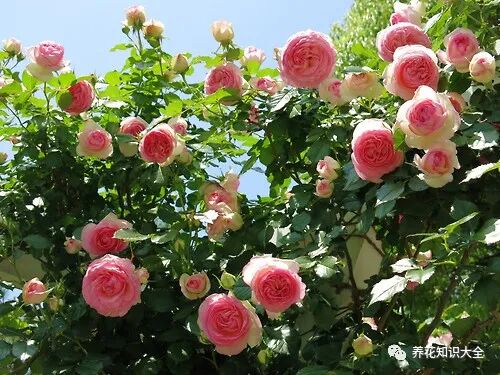 特点:大型藤本月季,多季持续开花,粉色花色,多头成片开放,植株非常健壮,抗病能力特别强。