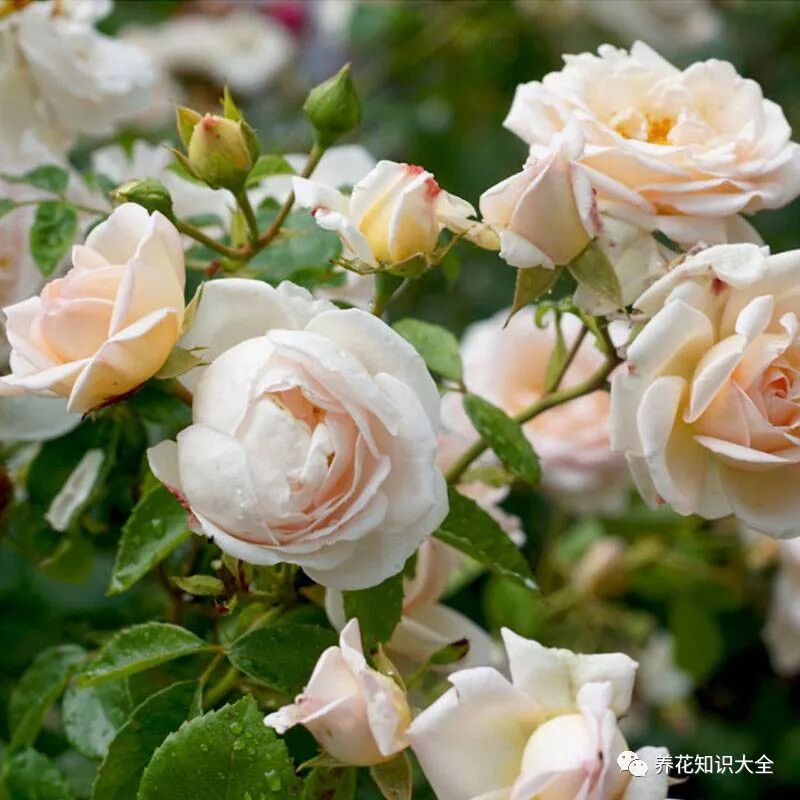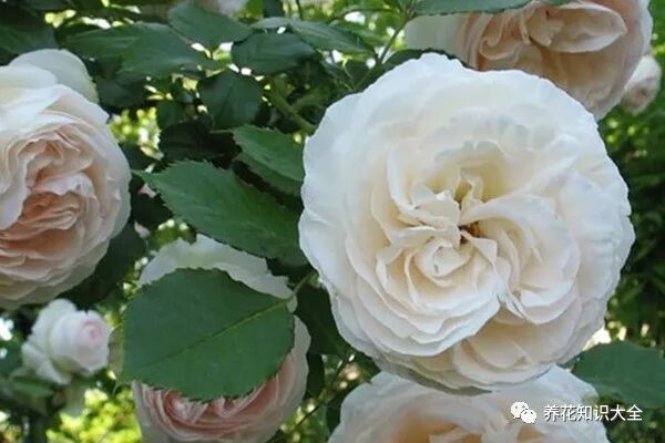 特点:春季开花,花色近乎纯白,但带有一点点粉,花朵成簇开放的,古典杯状花型,高度重瓣,抗病性也非常好。枝叶茂密、生长速度快,叶片深绿有光泽。