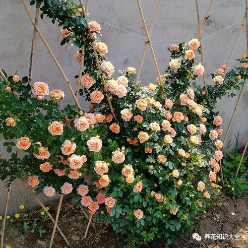 特点:大型藤本月季,春季或夏季一季花,杏黄色花色带橙色阴影,花大、开花数量多(多头成簇开放),抗病能力很强,攀爬性好。