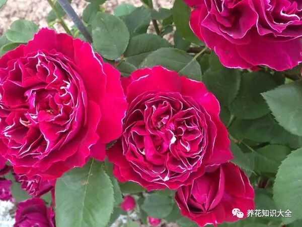 特点:春季爆开,其他季节零星开放,深红色的花瓣上勾勒着一条极细如丝的白色花边,很有辨识度,具浓浓的香味,花型平展,叶片大而稠密,枝条茂密,弯曲生长。