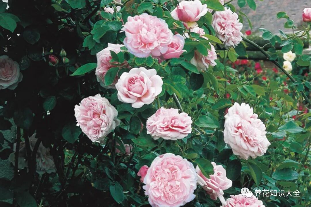 特点:多季持续开花,花量大,多头开放,淡粉色花色,花型一直很包,浓香,枝条很长,顶端开花,长势旺盛。