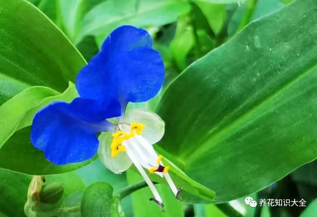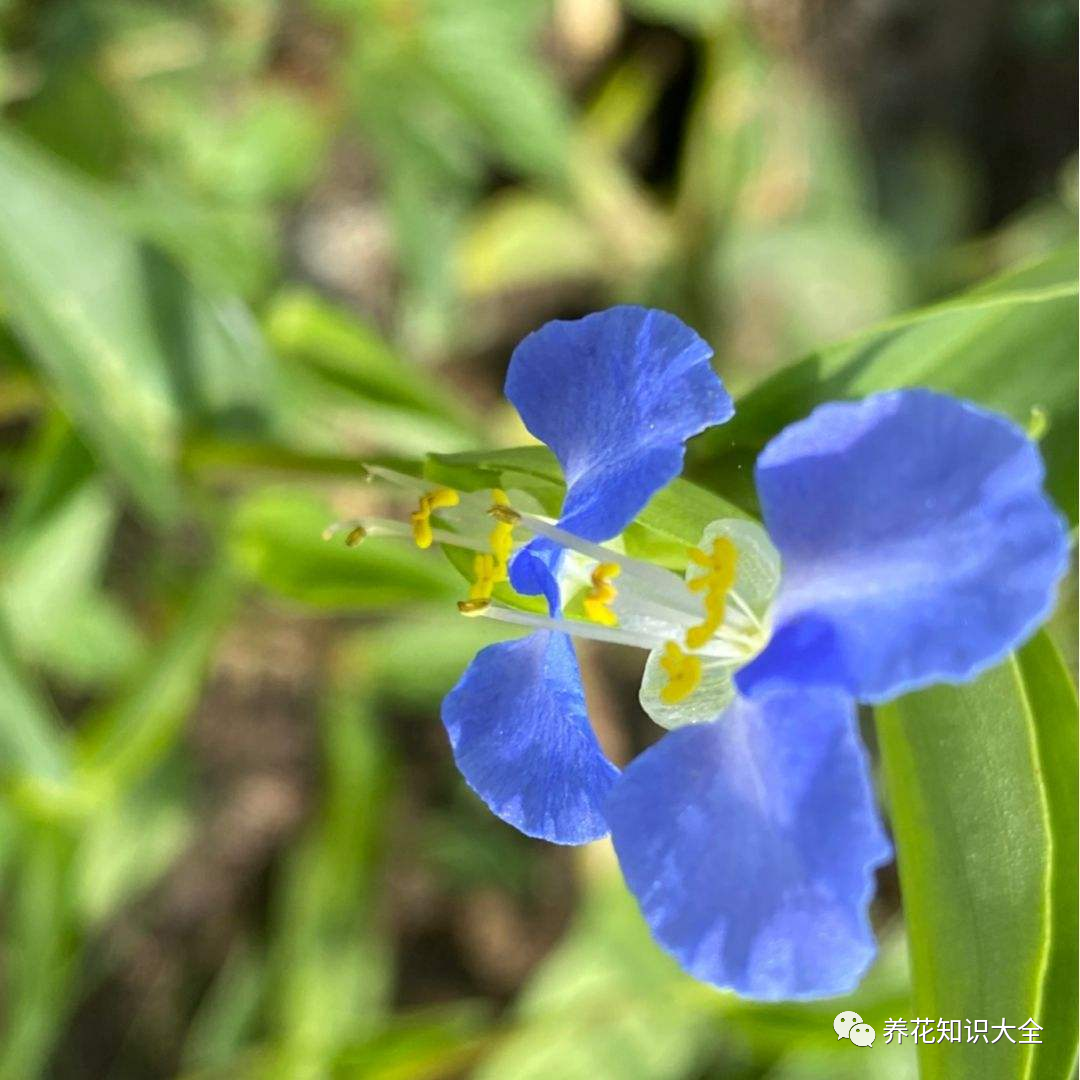 鸭跖草在东部地区更加常见,它的识别度非常高,最顶上的两瓣花瓣是蓝色,下面附着一瓣白色的花瓣和几根须。