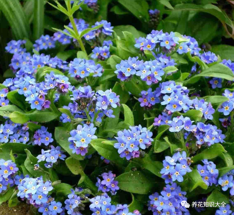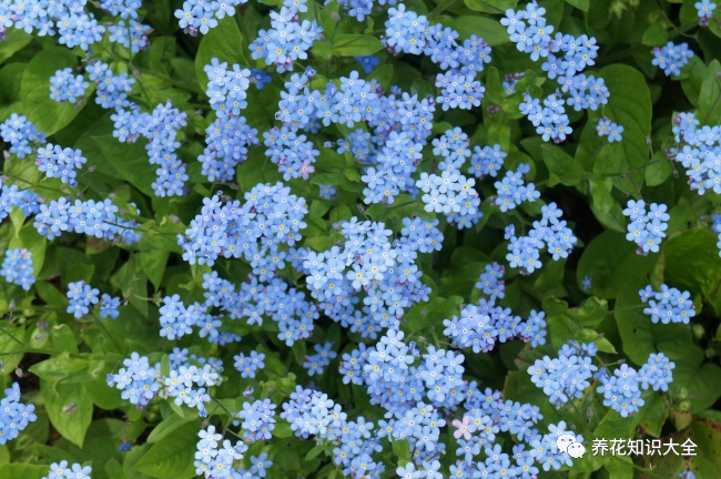 大家经常听到的浪漫型花卉勿忘我也是蓝色系的花卉,它的花朵非常多,蓝色的花瓣配上黄色的花芯,簇拥在一起显得特别清新可爱,大家经常拿来送给自己的心上人。