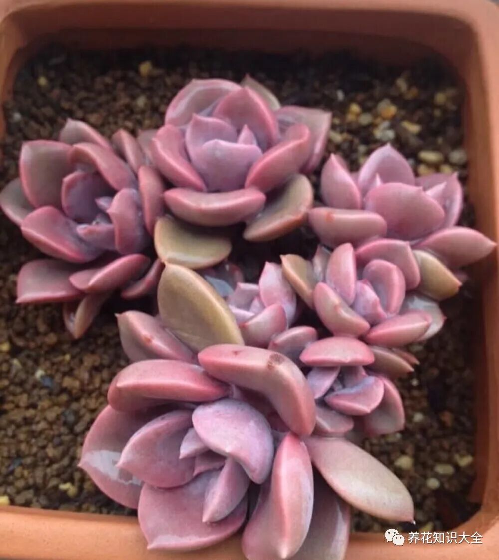 多肉植物黛比是一个杂交品种,只要不是严格缺光或者大量浇水,一年四季看上去叶子都是粉嫩嫩的,或者带着一丝梦幻紫。秋天天气变凉以后,黛比会快速上色,变成粉紫色,让人刮目相看。到了秋末冬初的时候,黛比的颜色会变成深紫色,真的太亮眼了。