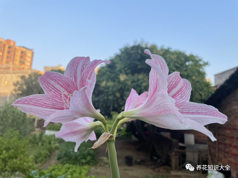 朱顶红的养护也是非常简单的,只要找个比朱顶红种球大一圈的花盆,将朱顶红只埋进土壤里一半就可以啦~发芽之后一个月左右就能开花啦~