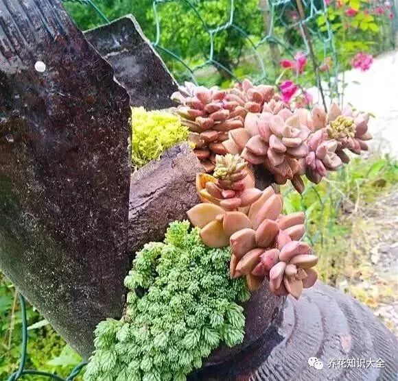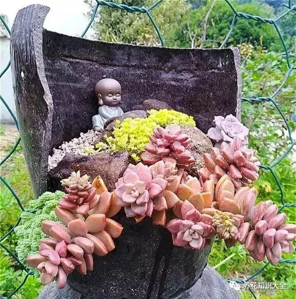 还别说,他用破坛子养出来的多肉确实美,盆盆造型独特,人见人夸,不少多肉爱好者都模仿他的做法~