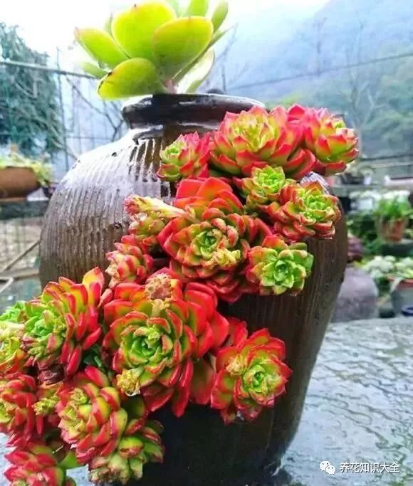将破坛子横向切割一半,养一些喜欢群生爆头的多肉品种,一个坛子顶两个花盆。纵向对半切割,横躺着栽种上多种小型多肉,形成彩色的多肉拼盘,也是超级可爱。