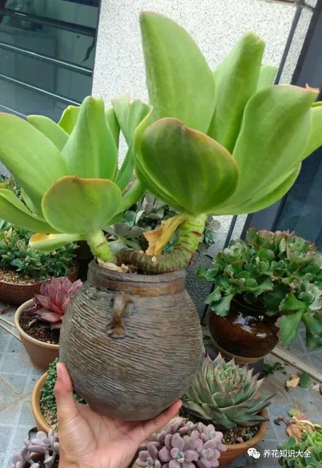 他说家里的多肉从没有一盆是正经买花盆养的,几乎都是用破坛子,比如腌酸菜烂了的坛子、店家丢掉的破酒坛,还有酱油缸,反正只要是看见破坛子,他都捡回来养多肉。他说这些破坛子养多肉比好多花盆都美,陶质且古朴,配上多肉很大气。