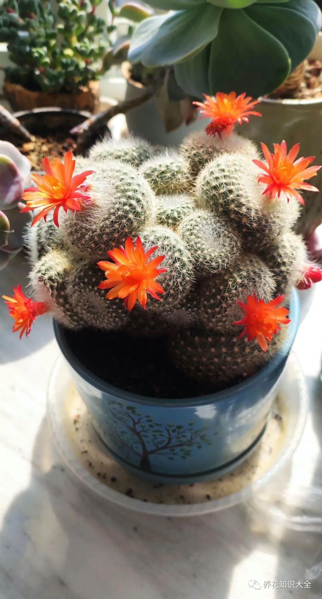 仙人掌因为它的叶片是肉质的,有着很强大的储水能力,所以平时不用怎么浇水就能养护得很好,只需要放在光照好的地方就可以了,而且仙人掌也很好开花,开的花朵大的时候能比盆栽还大。