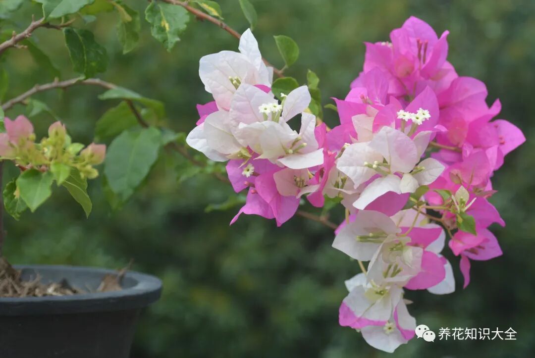 三角梅变色龙是勤花品种,光照充足、养分供应充足可以连续不断的开花。变色龙的花色会随着时间和光照而发生变化,看起来特别梦幻。变色龙的枝叶相对细软一些,容易开成大花球。