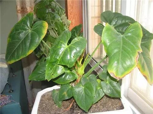 如文竹;如果是喜温暖的植物,很有可能是受了冻,导致很多叶子被冻坏枯边,如绿萝等。