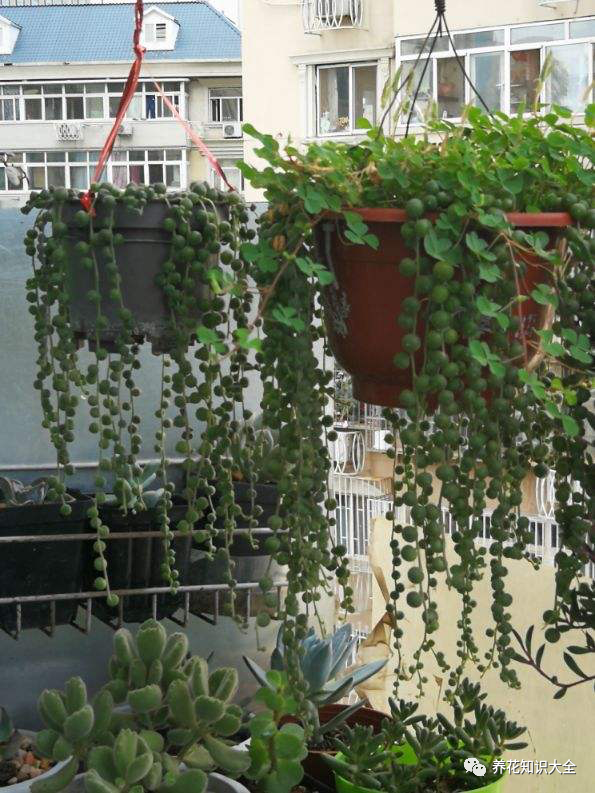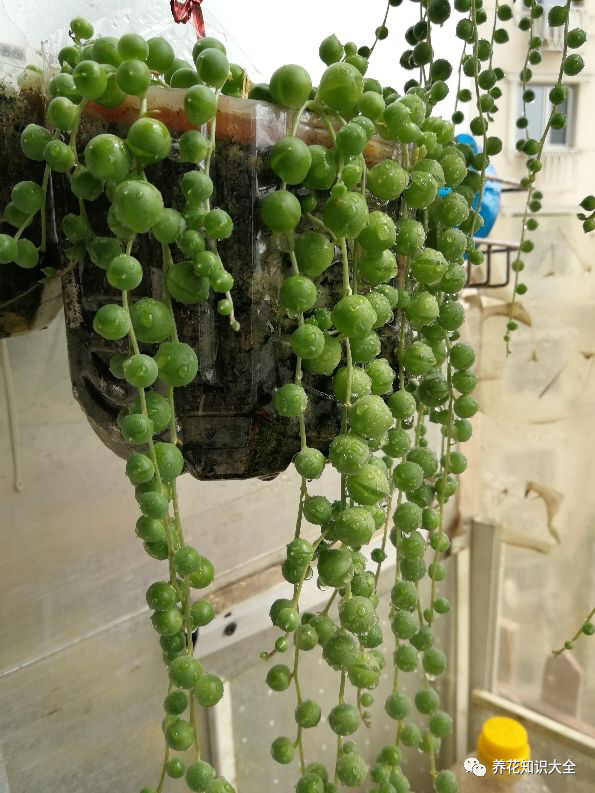 佛珠吊兰是多肉的一种,它的叶片是肉质的,养得好的话,叶片就是肉鼓鼓的,像一个个小肉球一样串在一起,所以叫它“佛珠”也不为过了。佛珠吊兰的根系不是很发达,再加上叶片是肉质的,更要小心盆栽内积水情况的出现了,花花建议在土壤里覆盖一些煤渣,来帮助土壤增强它的透气性。