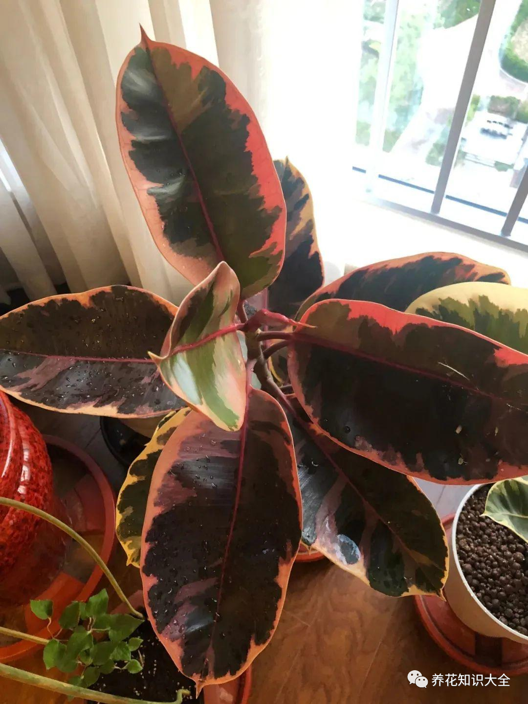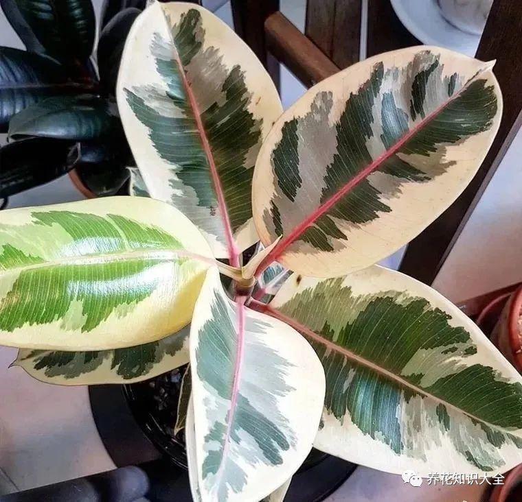 花叶橡皮树和普通的橡皮树其实没什么区别,是非常适合养护在室内的乔木,花叶橡皮树的叶子上有粉色的斑纹,虽然养护起来和普通橡皮树同样简单,但是颜值却高了不止一点。
