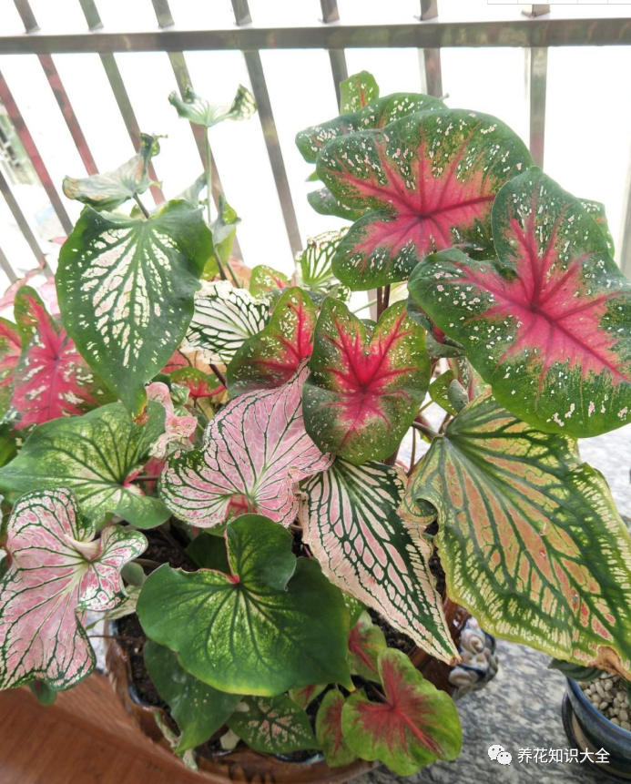 彩叶芋又叫五彩芋,它的叶片不仅有粉色,紫的、绿的、白的都非常好看,而且彩叶芋叶片的形状也非常特别,像是盾牌一样,而且质地也各不相同,有的是厚革质的,有的是半透明的,各有千秋但花花个人比较喜欢半透明质地的,在光照下看薄如蝉翼,非常诱人。