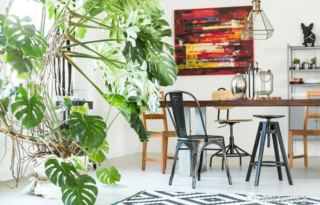 小棵的龟背竹可以养在卧室、书房,大棵的龟背竹就可以养在客厅里。养护得当的龟背竹,叶子超大,翠绿油亮,又很有个性,能让客厅有一种与众不同的美丽。龟背竹寓意长寿,“吉祥”又美丽,是非常优秀的观叶绿植。有些龟背竹养上四五年,绿叶盎然,客厅就像一个小森林一样,空气特别清新。